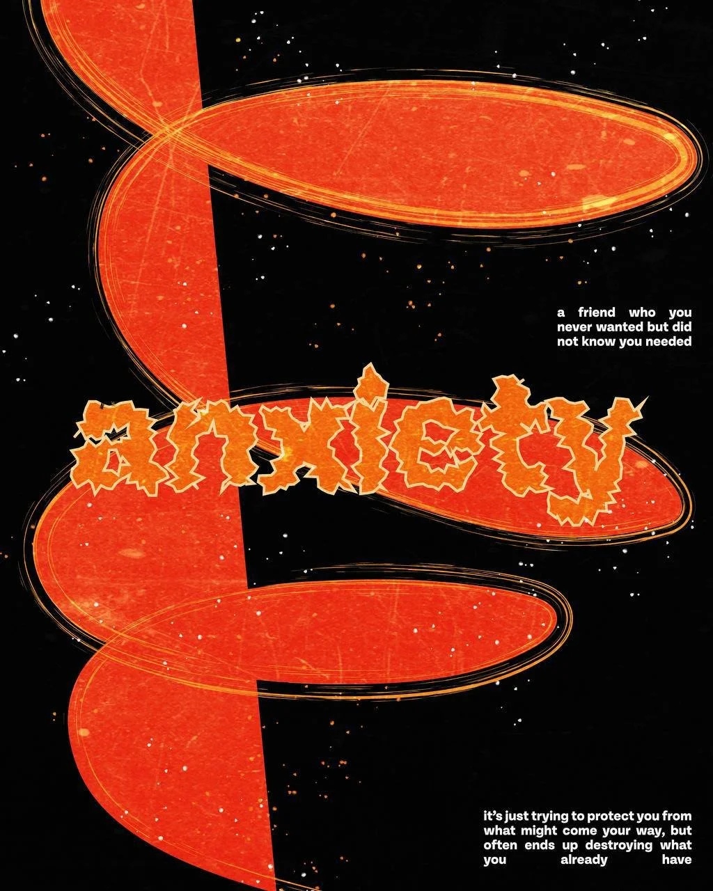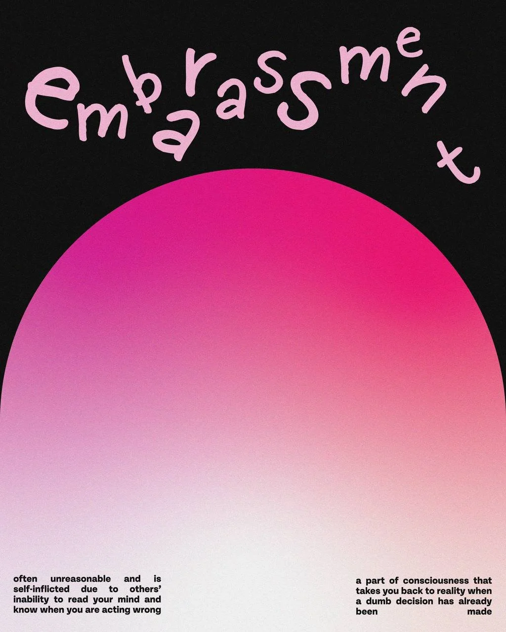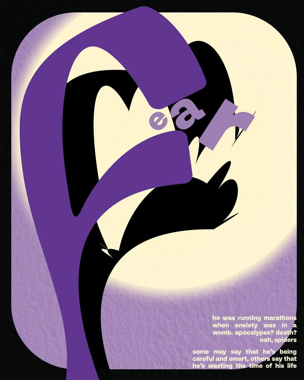 The main letter ‘F’ resembles of the character’s slouched pose. A spotlight, which is also a common phobia (being in a spotlight), casts a distorted black shadow on the wall.