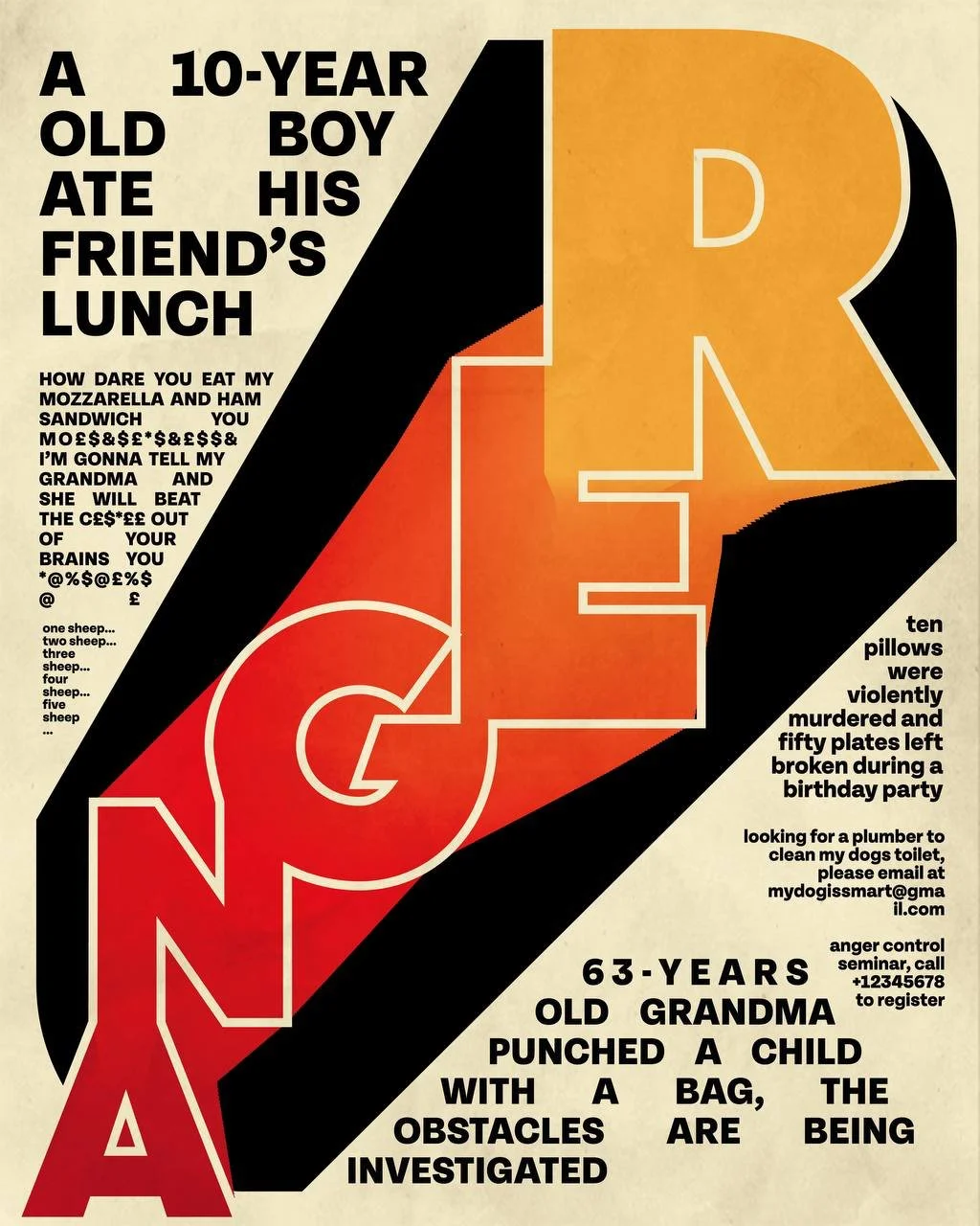 The large ‘screaming’ letters are filled in with fire-like gradient, resembling of the literal fire that appears on Anger’s head when he has an outburst. The smaller copy features absurd newspaper headlines, which make the character unreasonably frustrated.