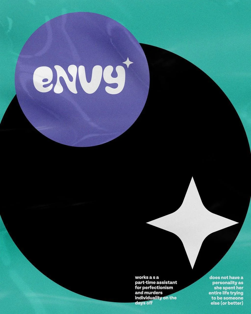 Envy’s name is showcased through flowy and uneven type that illustrates her often slimy demeanour. It was strategically positioned in a small circle that is trying to escape from the darker and larger one, showcasing Envy’s tendency to get into her own head while trying to be or act like others.